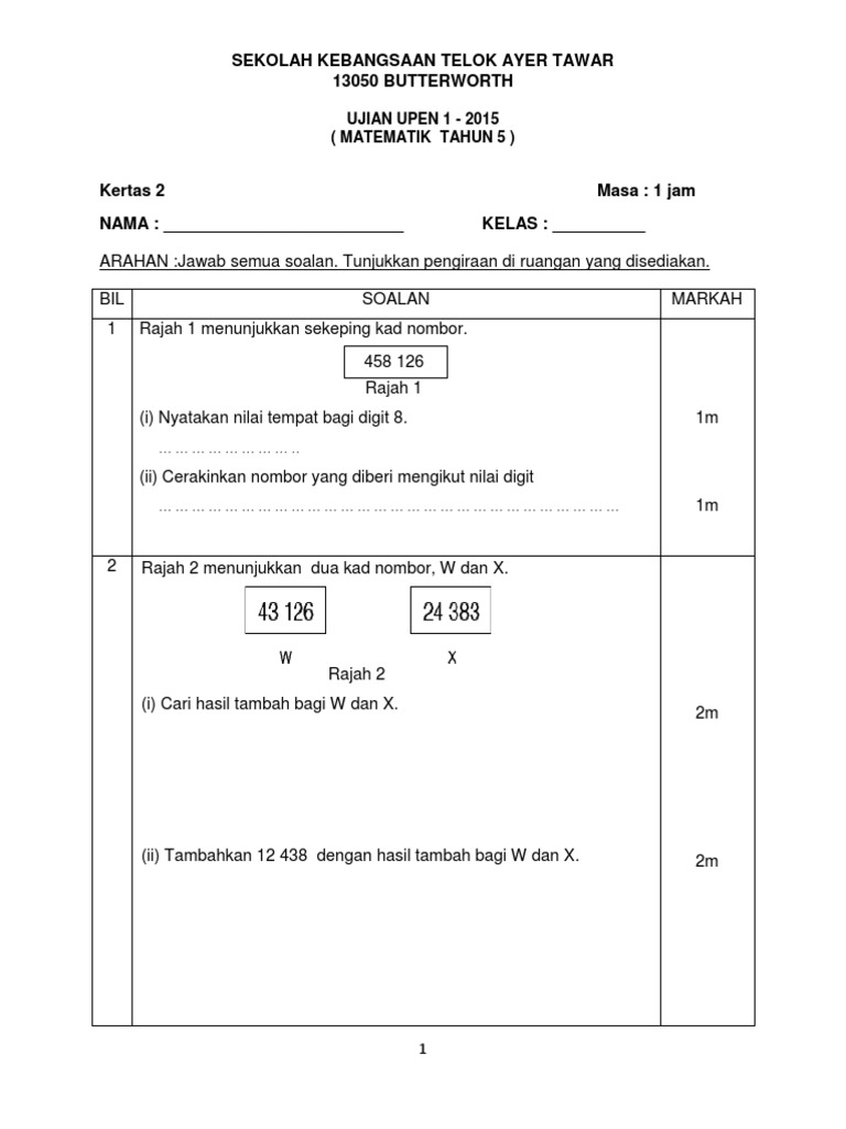 Soalan Matematik Tahun 5 Ujian 1 Bulan Mac 2017 Pdf